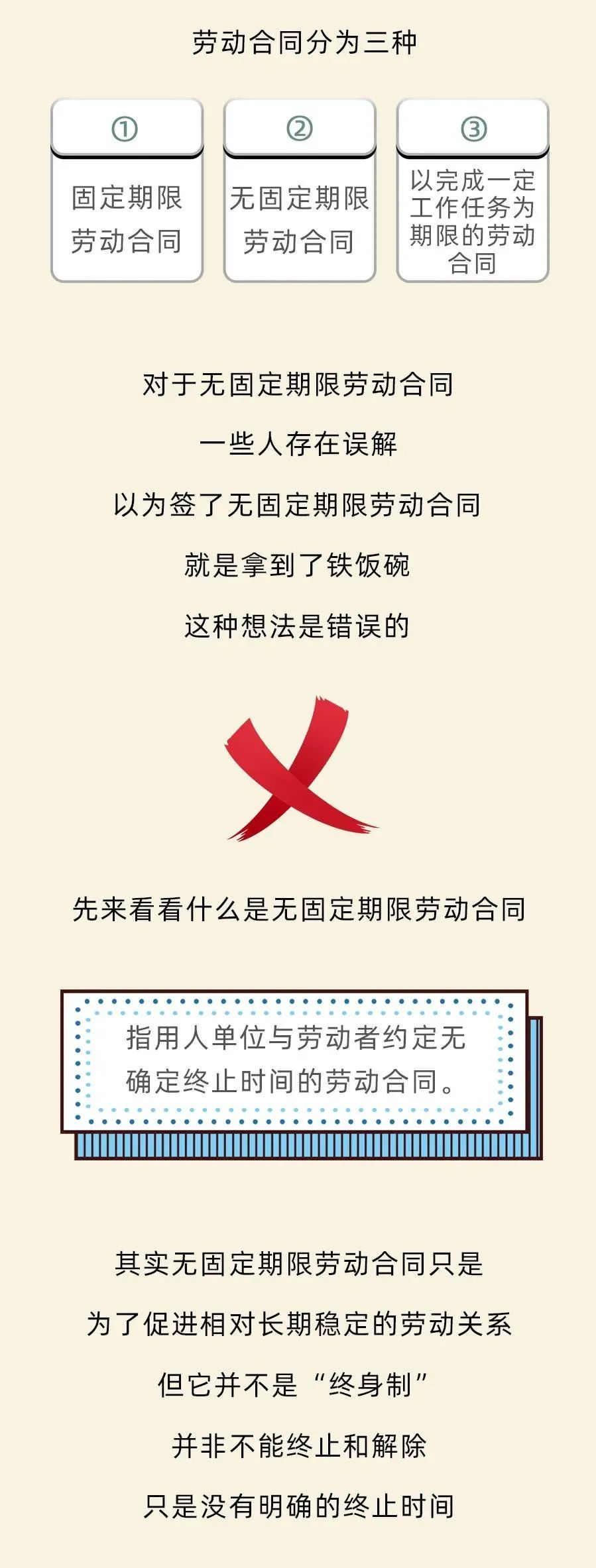 注意:无固定期限劳动合同并不是“终身制”,不能终止和解除,它只是有明确的建立时间而没有明确的终止时间、相对长期稳定的劳动关系。