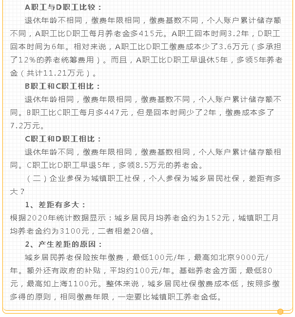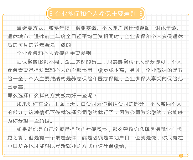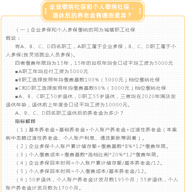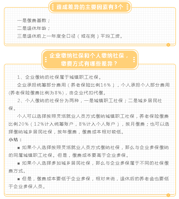 大家可能会陷入一个误区,认为实际缴费年限相同,退休后的养老金就一定相同,这种想法是错误的。因为影响养老金的因素不止缴费年限一个,对于企业参保和个人参保来说,它们属于两种不同的缴费方式。