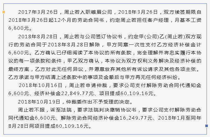 综上所述,协议书不存在可以撤销的法定情形,一审法院判决驳回周止若撤销协议书的诉讼请求,本院认可,予以维持。鉴于协议书系双方权利义务解决及经济补偿的最终方案,故双方劳动关系已经解除、劳动关系中所涉权利义务关系已经通过协议书处理完毕,周止若再行主张劳动关系存续期间的代通金、解除劳动合同经济补偿金、项目提成,无事实和法律依据,本院不予支持。