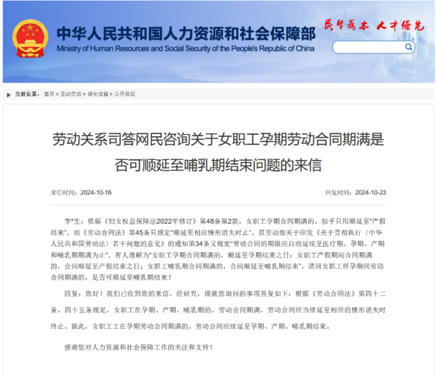 人社部于2024年10月24日在其官网就此问题进行了答复,明确了女职工在孕期劳动合同 期满的,劳动合同应续延至孕期、产期、哺乳期结束。