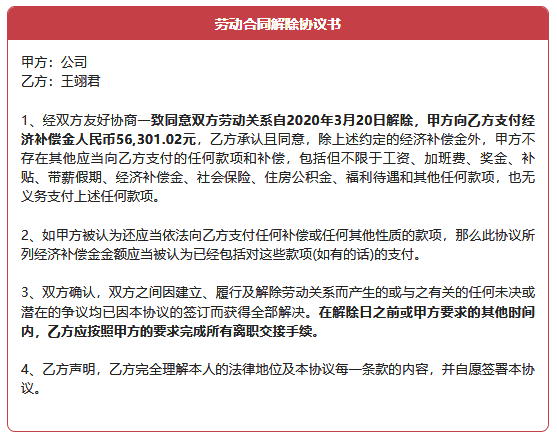 2020年2月19日,公司与王翊君商谈协商解除劳动关系事宜。当日下午14:40时,公司将解除协议文本通过电子邮件形式发送于王翊君,并要求王翊君在下班前回复确认邮件以及告知快递地址。