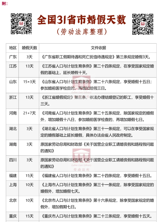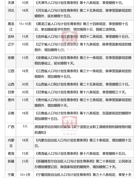 答:国家层面的婚假通常理解为3天,具体依据是《关于国营企业职工请婚丧假和路程假问题的通知》[80]劳总薪字29号的规定:职工本人结婚或职工的直系亲属(父母、配偶和子女)死亡时,可以根据具体情况,由本单位行政领导批准,酌情给予1至3天的婚丧假。目前国内大多数省份在国家规定的基础上增加了一定的婚假天数。比如,山西、甘肃婚假达到30天,多数省市在10-18天之间,而广东、广西等地只有3天。具体天数可参考本文后面附的全国31省市婚假天数一览表。