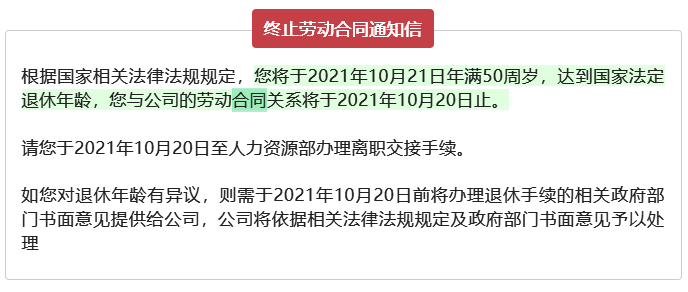 公司上诉:李莫愁于2021年10月20日24时即10月21日零时起年满50周岁,公司终止合法