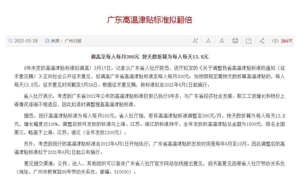 广东省人社厅消息,该厅拟定的《关于调整我省高温津贴标准的通知(征求意见稿)》正向社会公开征求意见,拟调高广东省高温津贴标准至每人每月300元;如按照规定需按天数折算高温津贴的,每人每天13.8元。征求意见时间截至3月24日。根据征求意见稿,新标准拟自2021年6月1日起施行。