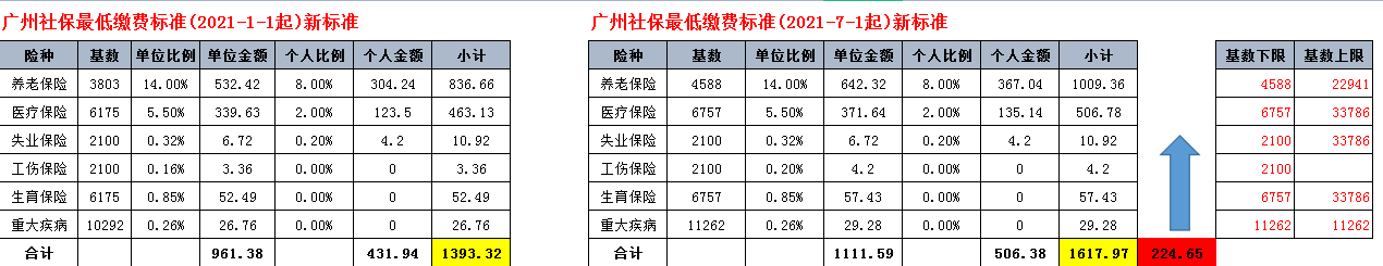 从2021年7月1日起广州职工社会保险缴费基数调整如下: